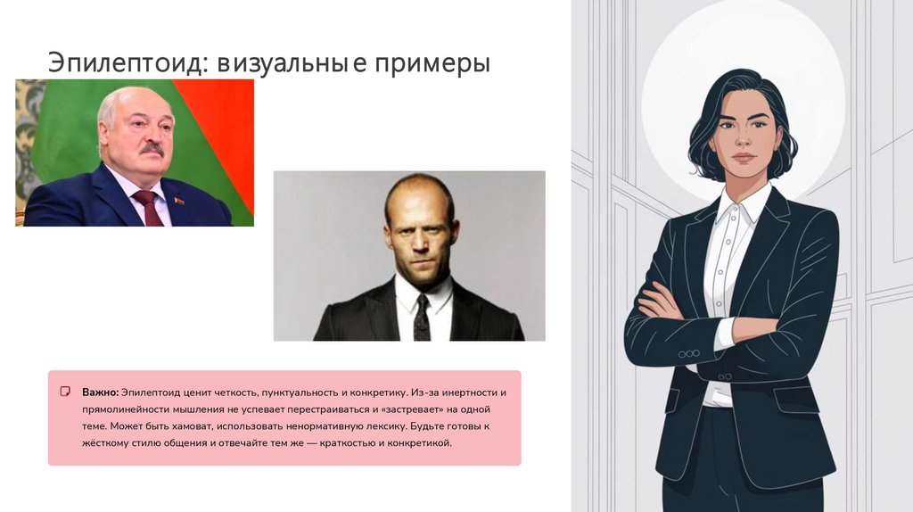 Эпилептоид: в изуальны е примерыВажно: Эпилептоид ценит четкость, пунктуальность и конкретику. Из-за инертности и