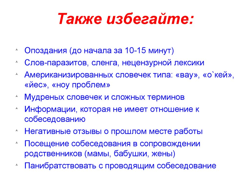 Также избегайте:Опоздания (до начала за 10-15 минут)