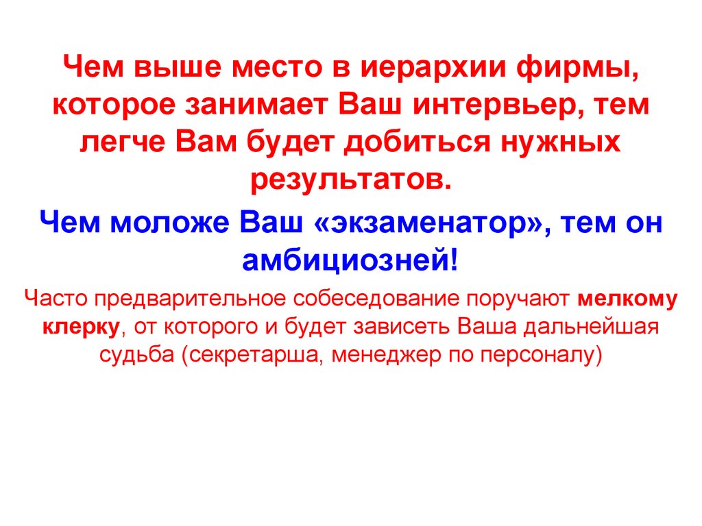 Чем выше место в иерархии фирмы,которое занимает Ваш интервьер, тем