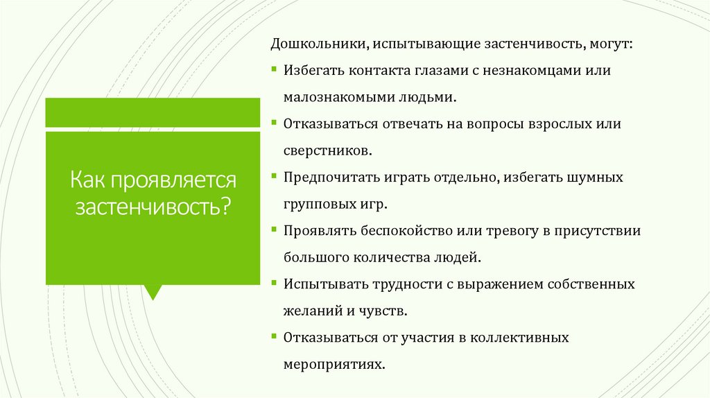 Дошкольники, испытывающие застенчивость, могут:Избегать контакта глазами с незнакомцами или