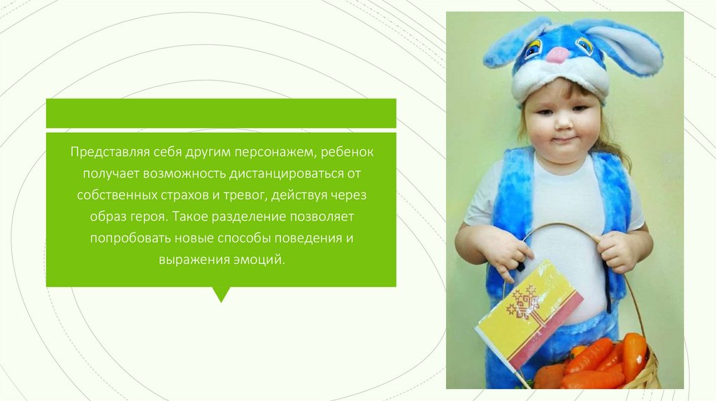 Представляя себя другим персонажем, ребенокполучает возможность дистанцироваться от