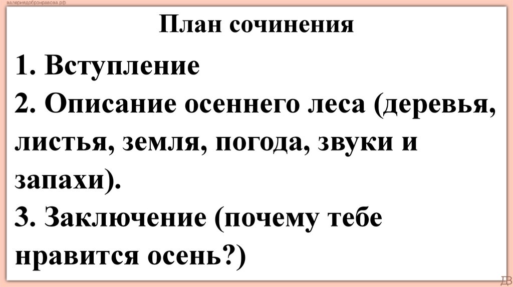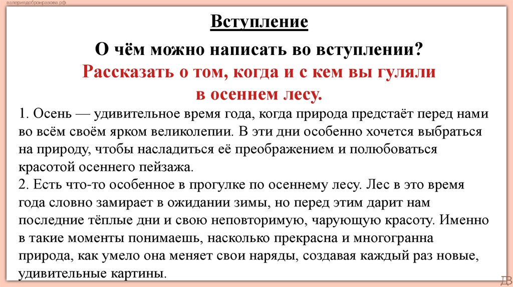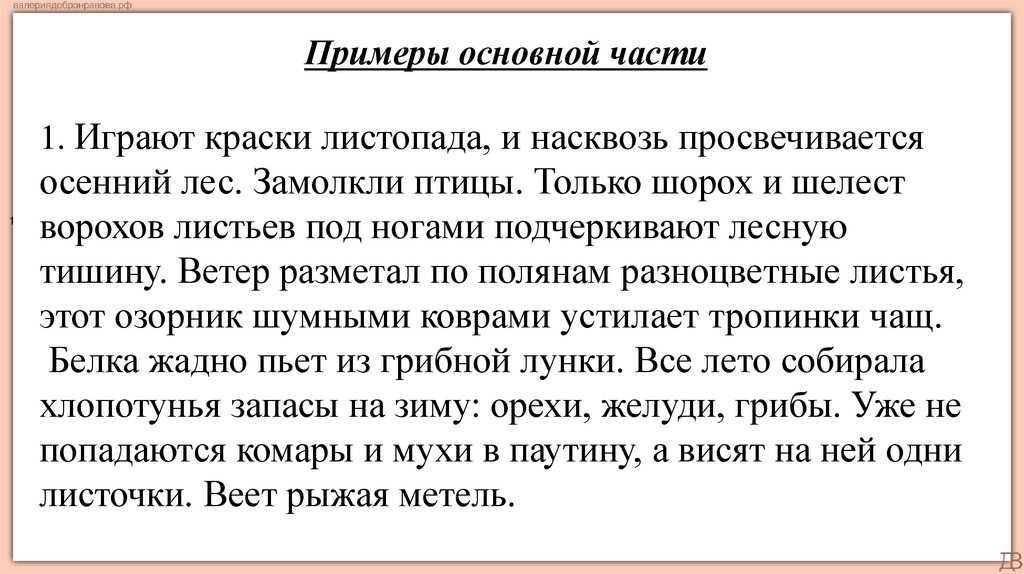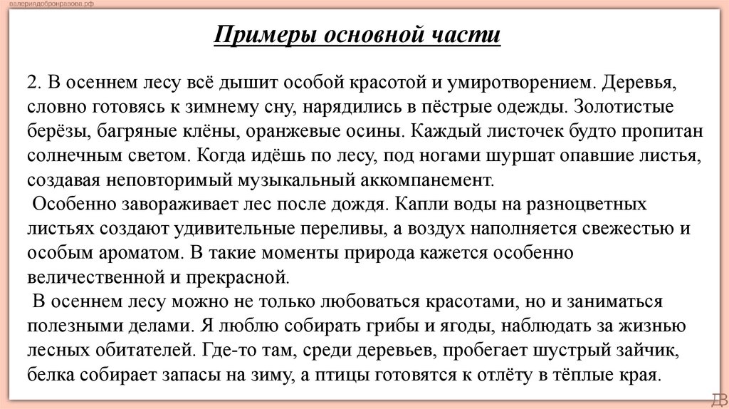 Примеры основной части2. В осеннем лесу всё дышит особой красотой и умиротворением. Деревья,