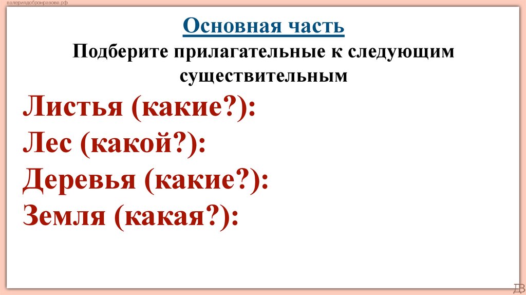 Основная частьПодберите прилагательные к следующим