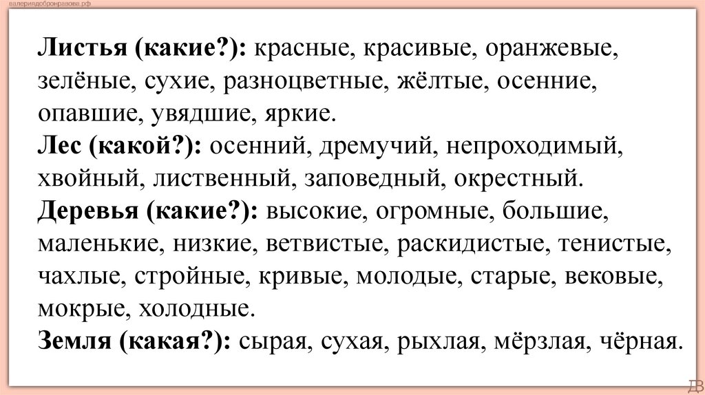 Листья (какие?): красные, красивые, оранжевые,зелёные, сухие, разноцветные, жёлтые, осенние,