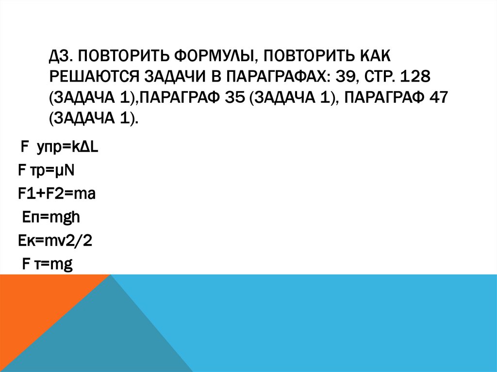 ДЗ. ПОВТОРИТЬ ФОРМУЛЫ, ПОВТОРИТЬ КАКРЕШАЮТСЯ ЗАДАЧИ В ПАРАГРАФАХ: 39, СТР. 128