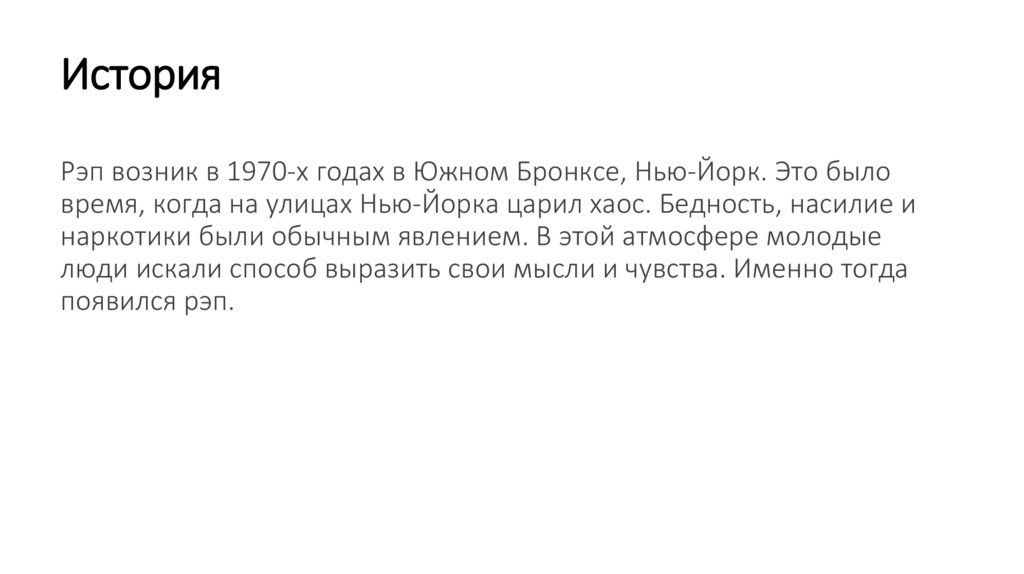 ИсторияРэп возник в 1970-х годах в Южном Бронксе, Нью-Йорк. Это было