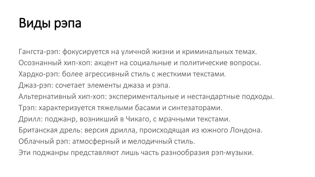 Виды рэпаГангста-рэп: фокусируется на уличной жизни и криминальных темах.