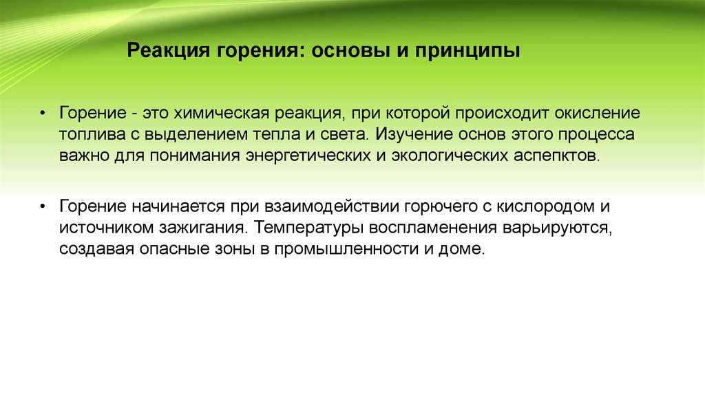 Реакция горения: основы и принципы• Горение - это химическая реакция, при которой происходит окисление