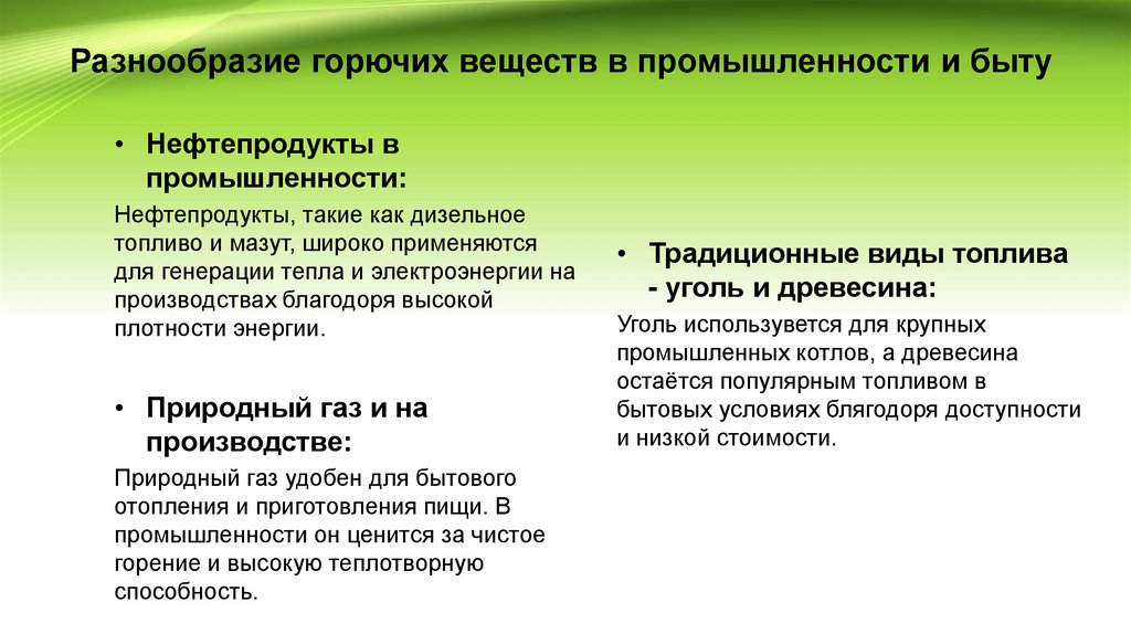 Разнообразие горючих веществ в промышленности и быту• Нефтепродукты в