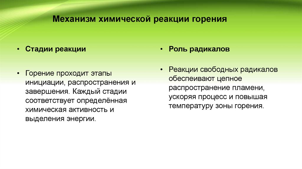 Механизм химической реакции горения• Стадии реакции