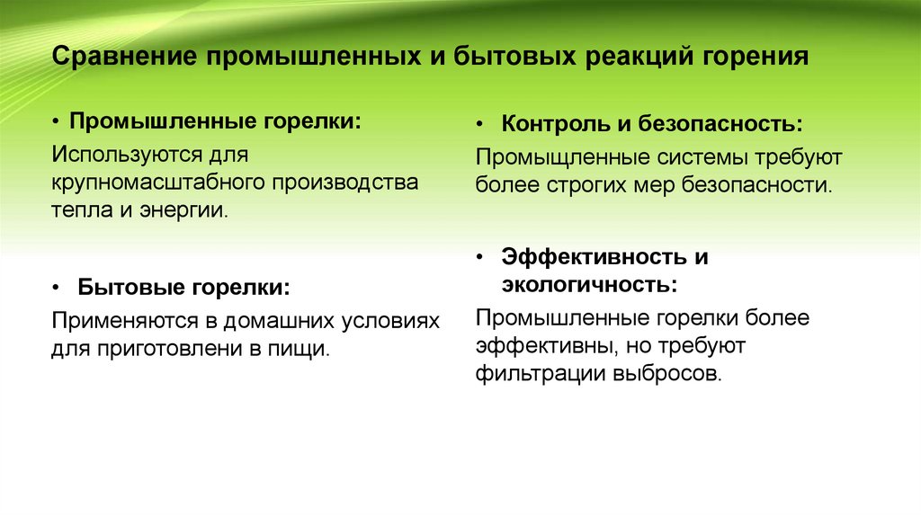 Сравнение промышленных и бытовых реакций горения• Промышленные горелки: