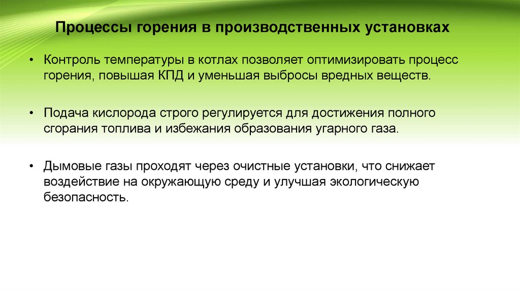Процессы горения в производственных установках• Контроль температуры в котлах позволяет оптимизировать процесс