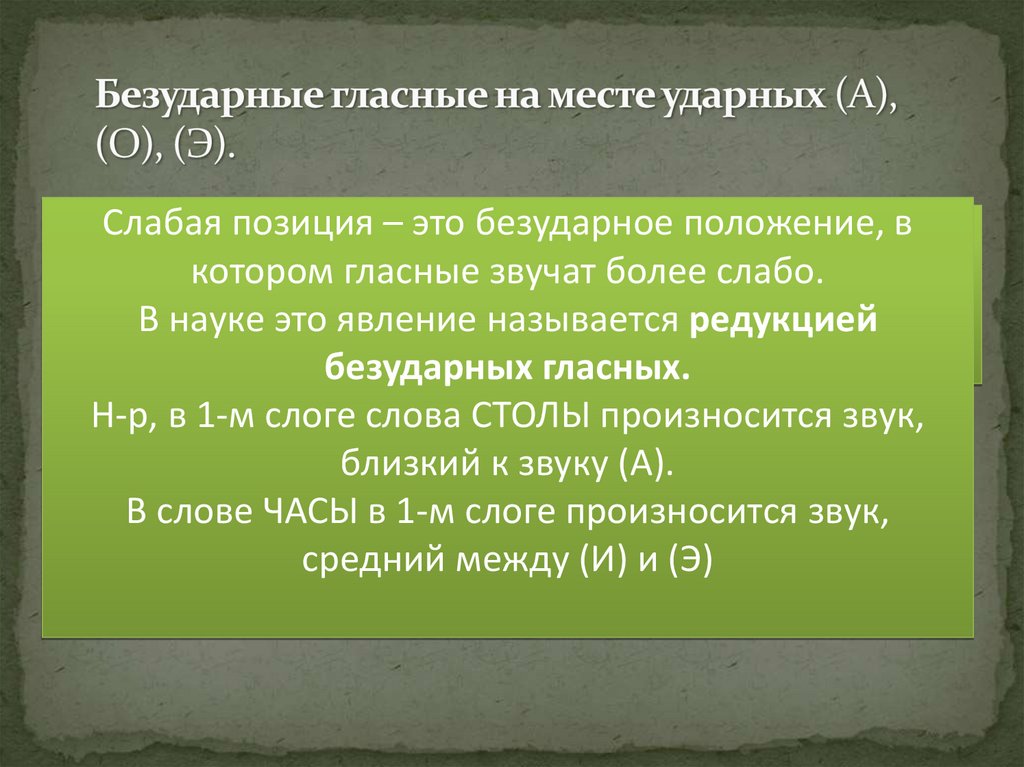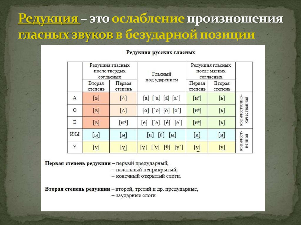 12. Редукция – это ослабление произношения гласных звуков в безударной позиции