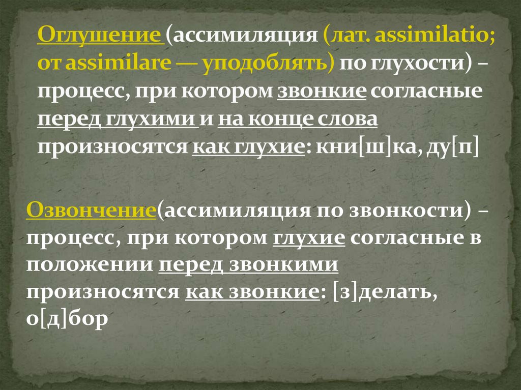 13. Оглушение (ассимиляция (лат. assimilatio; от assimilare — уподоблять) по глухости) – процесс, при котором звонкие согласные