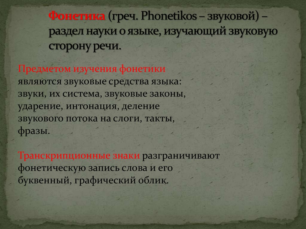 3. Фонетика (греч. Phonetikos – звуковой) – раздел науки о языке, изучающий звуковую сторону речи.