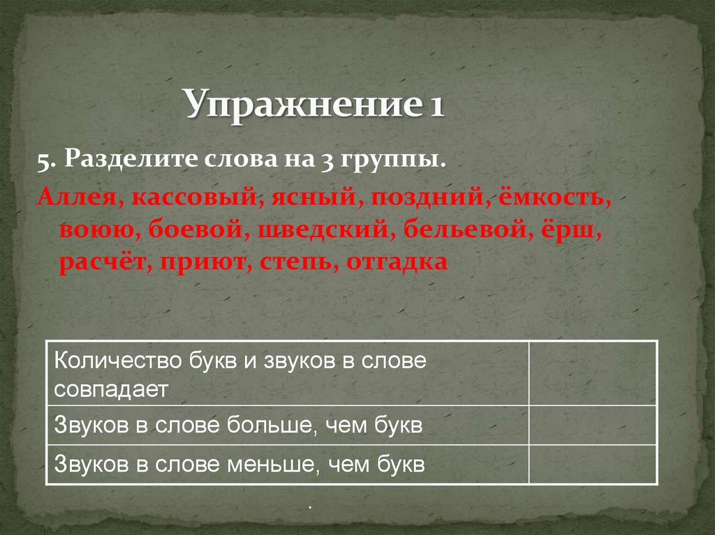 5. Разделите слова на 3 группы.Аллея, кассовый, ясный, поздний, ёмкость,