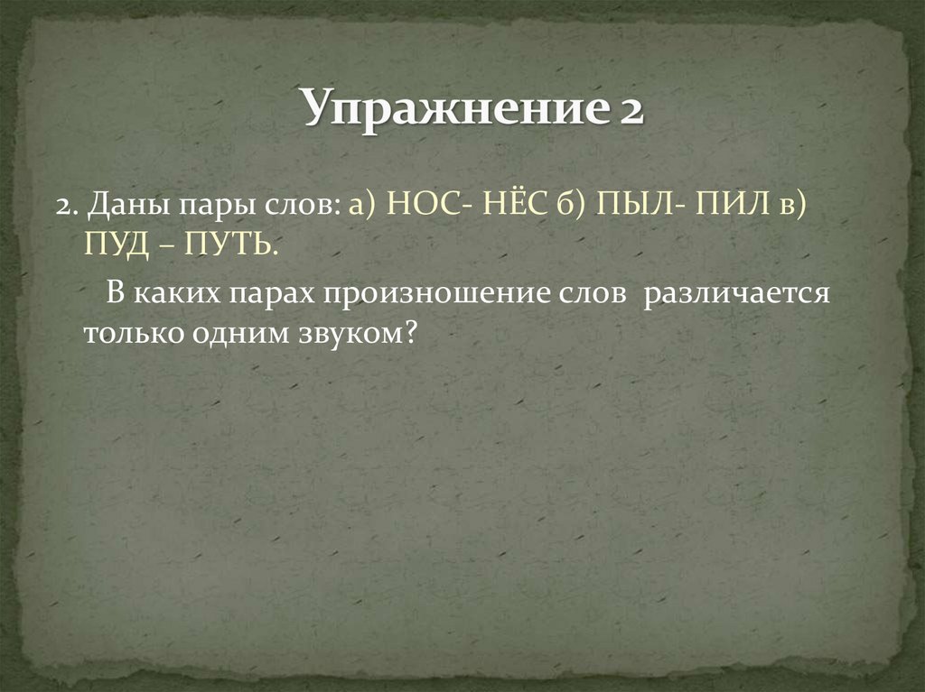2. Даны пары слов: а) НОС- НЁС б) ПЫЛ- ПИЛ в)ПУД – ПУТЬ.