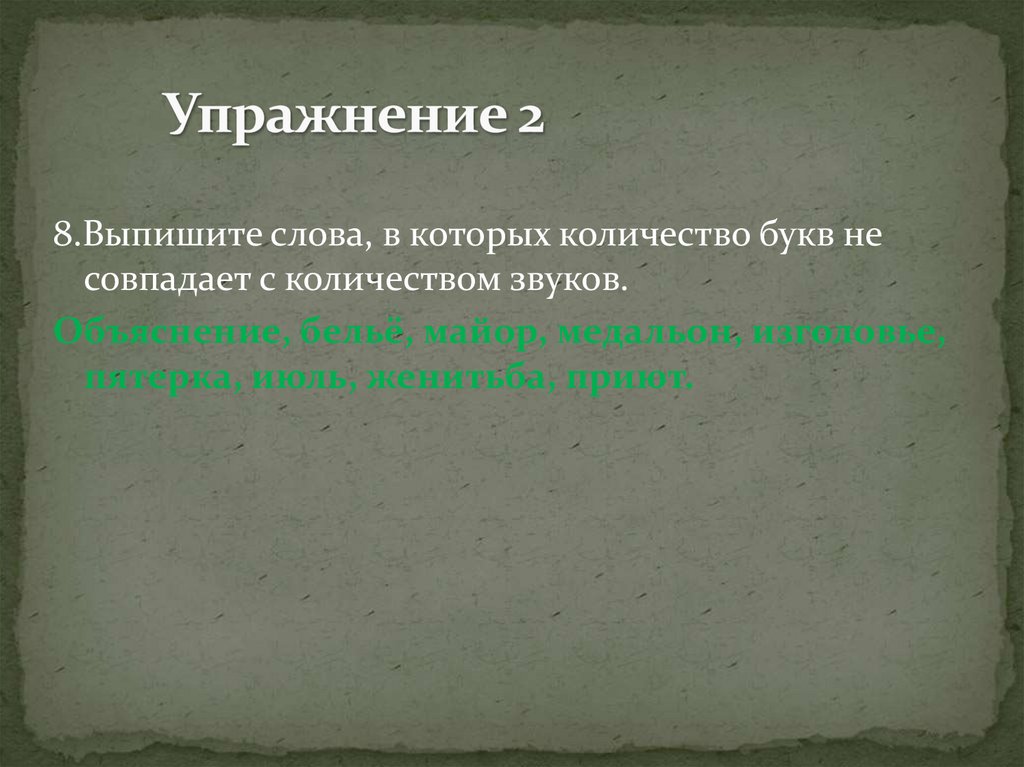 8.Выпишите слова, в которых количество букв несовпадает с количеством звуков.