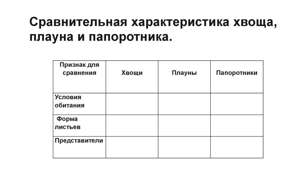 Сравнительная характеристика хвоща,плауна и папоротника.