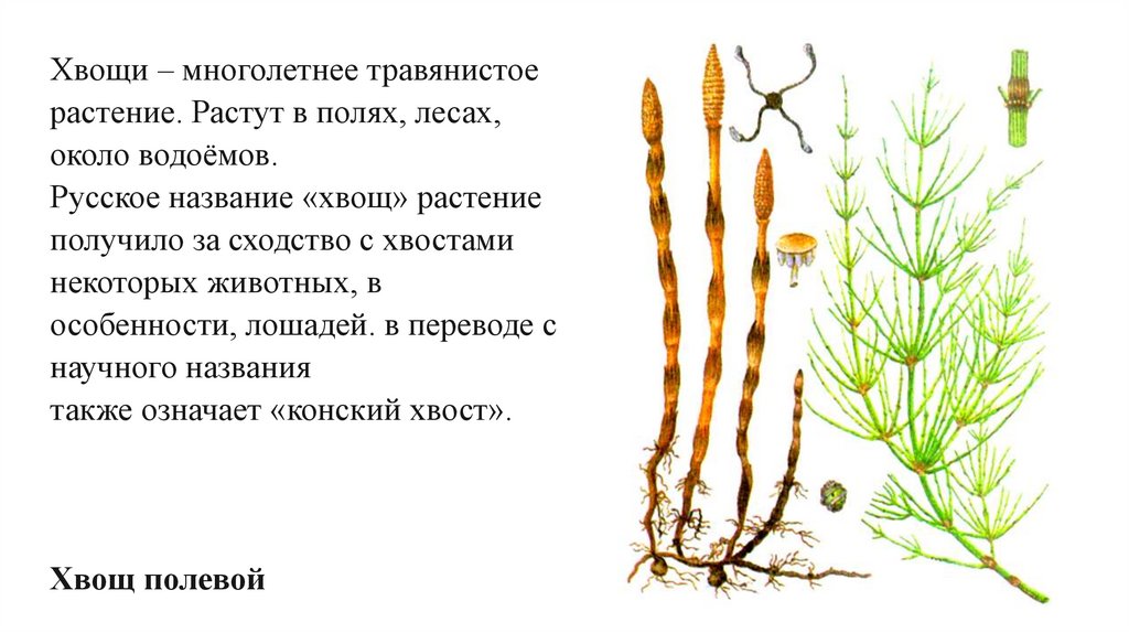 7. Хвощи – многолетнее травянистое растение. Растут в полях, лесах, около водоёмов. Русское название «хвощ» растение получило за