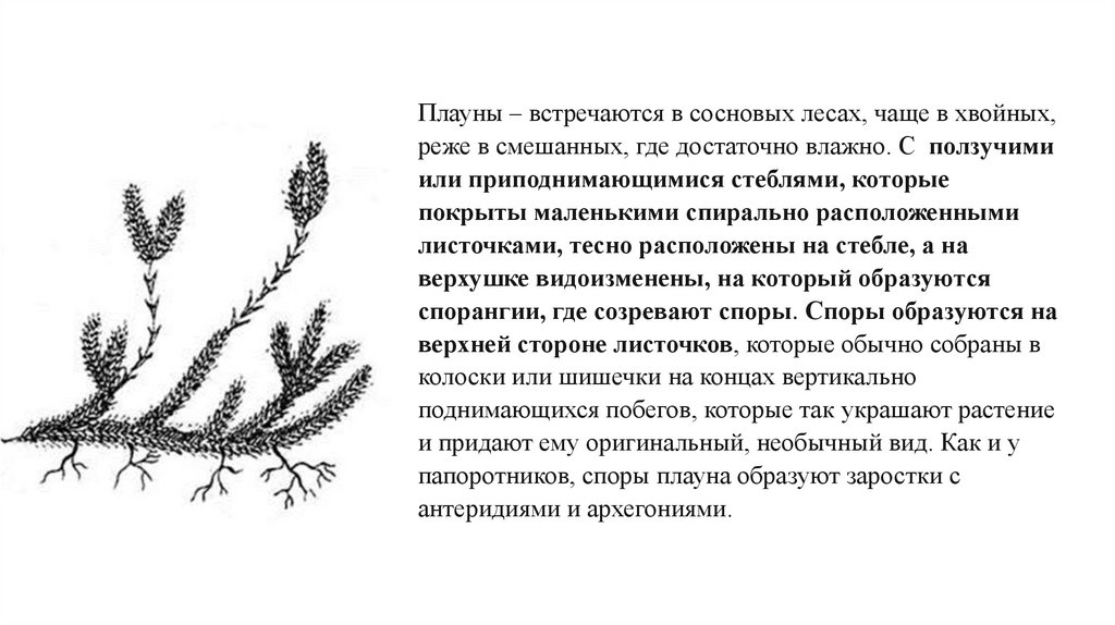 Плауны – встречаются в сосновых лесах, чаще в хвойных,реже в смешанных, где достаточно влажно. С ползучими