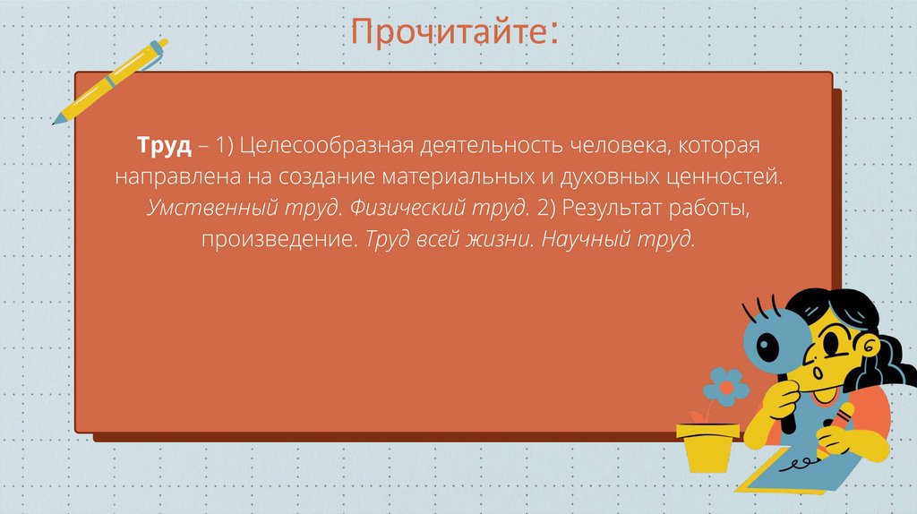 Прочитайте:Труд – 1) Целесообразная деятельность человека, которая