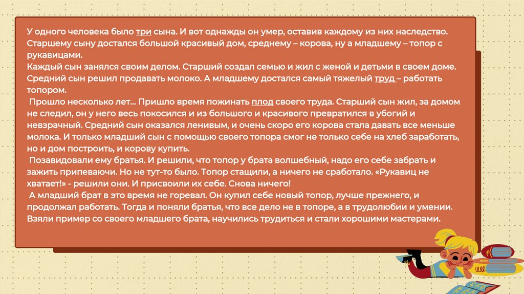 У одного человека было три сына. И вот однажды он умер, оставив каждому из них наследство.Старшему сыну достался большой красивый дом, среднему – корова, ну а младшему – топор с
