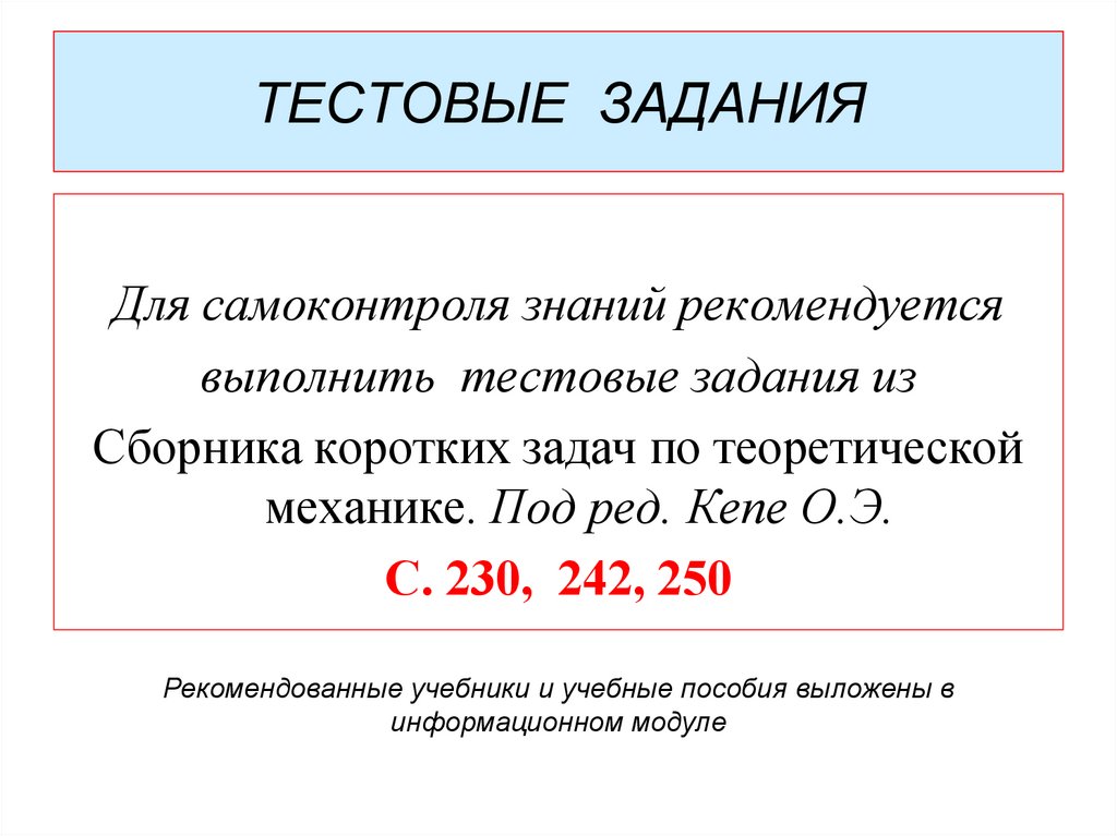Для самоконтроля знаний рекомендуетсявыполнить тестовые задания из