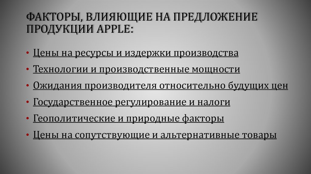 ФАКТОРЫ, ВЛИЯЮЩИЕ НА ПРЕДЛОЖЕНИЕПРОДУКЦИИ APPLE: