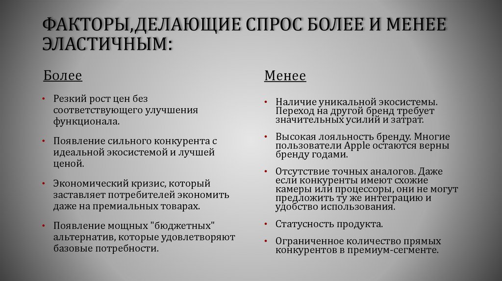ФАКТОРЫ,ДЕЛАЮЩИЕ СПРОС БОЛЕЕ И МЕНЕЕЭЛАСТИЧНЫМ:
