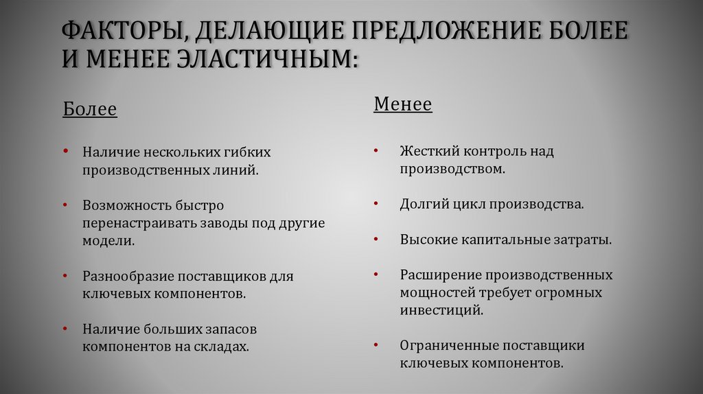 ФАКТОРЫ, ДЕЛАЮЩИЕ ПРЕДЛОЖЕНИЕ БОЛЕЕИ МЕНЕЕ ЭЛАСТИЧНЫМ:
