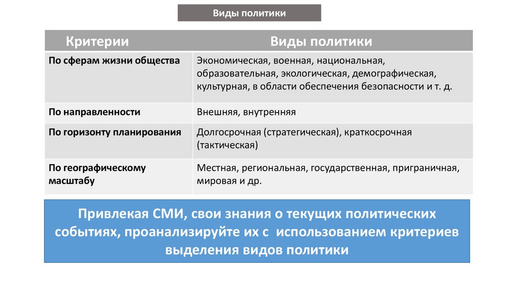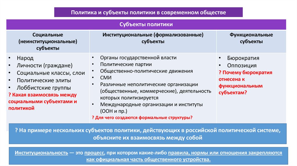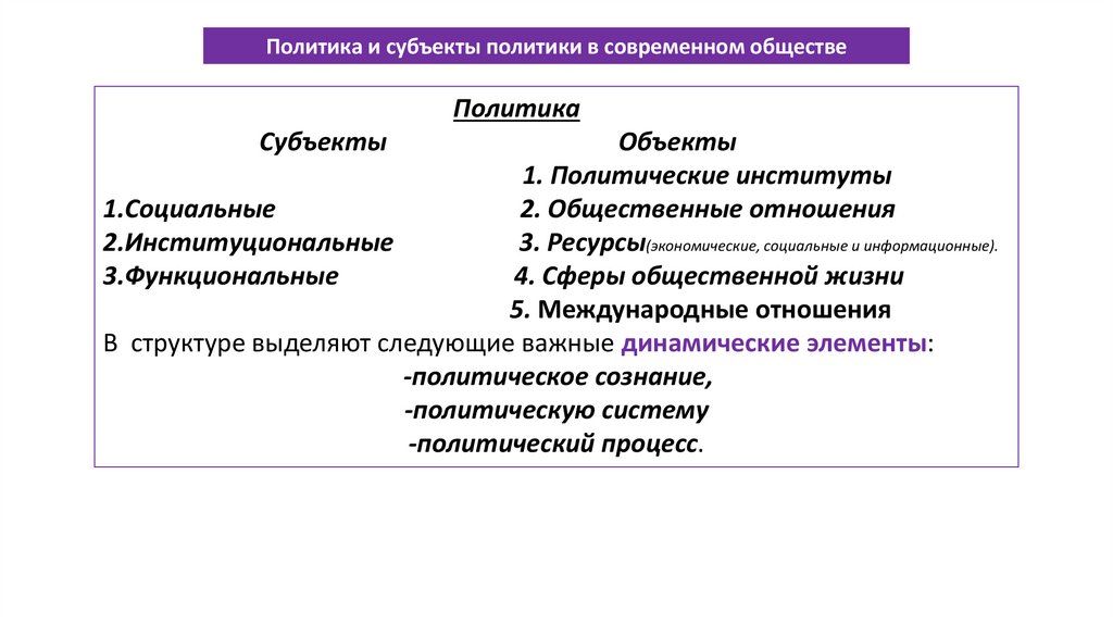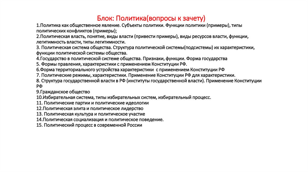 1. Блок: Политика(вопросы к зачету) 1.Политика как общественное явление. Субъекты политики. Функции политики (примеры), типы