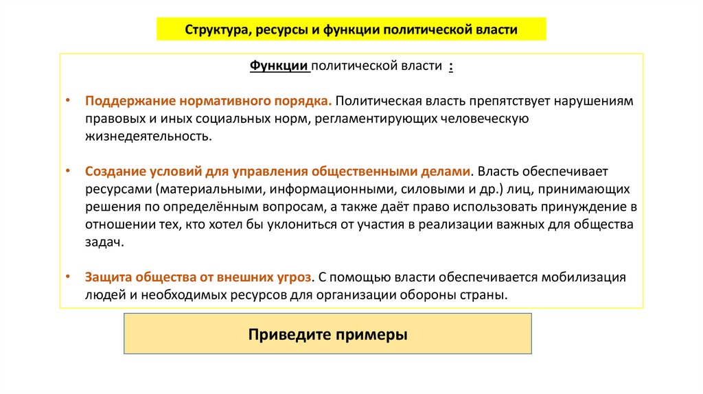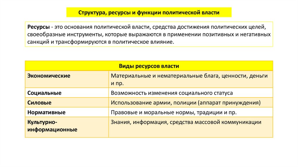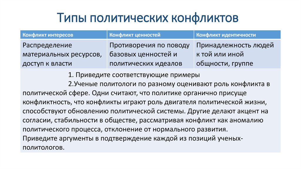 политических конфликтов (примеры);2.Политическая власть, понятие, виды власти (привести примеры), виды ресурсов власти, функции,