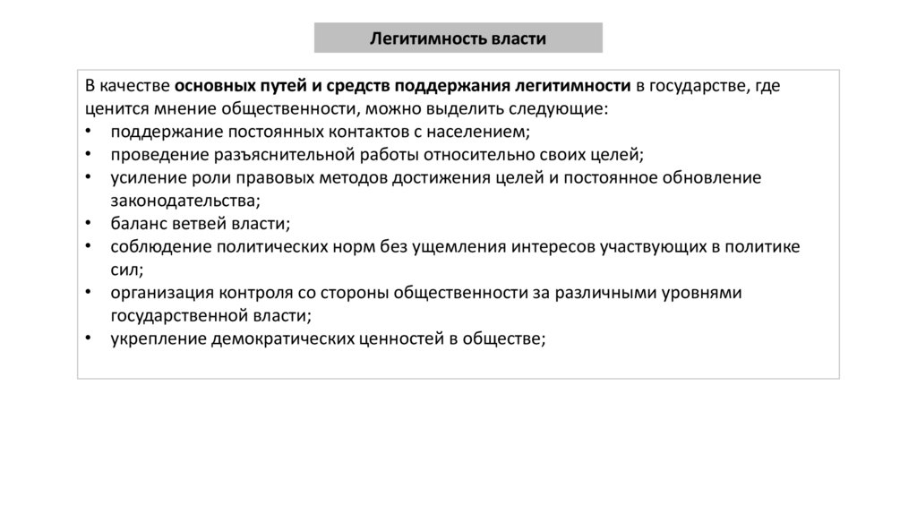Легитимность властиВ качестве основных путей и средств поддержания легитимности в государстве, где