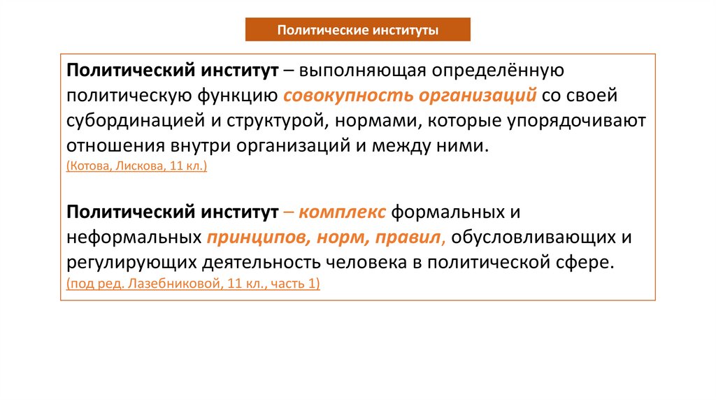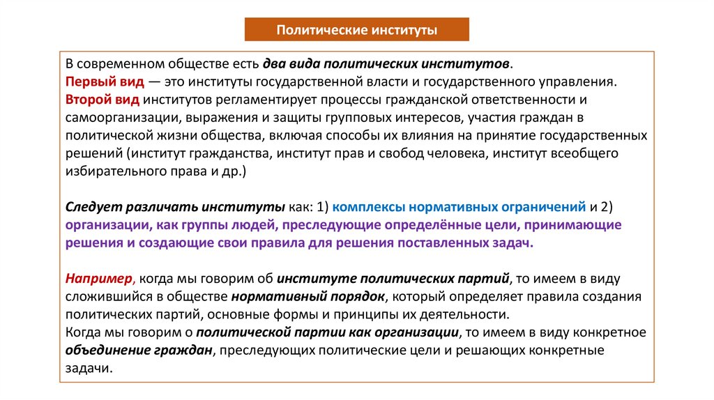 Например, когда мы говорим об институте политических партий, то имеем в виду