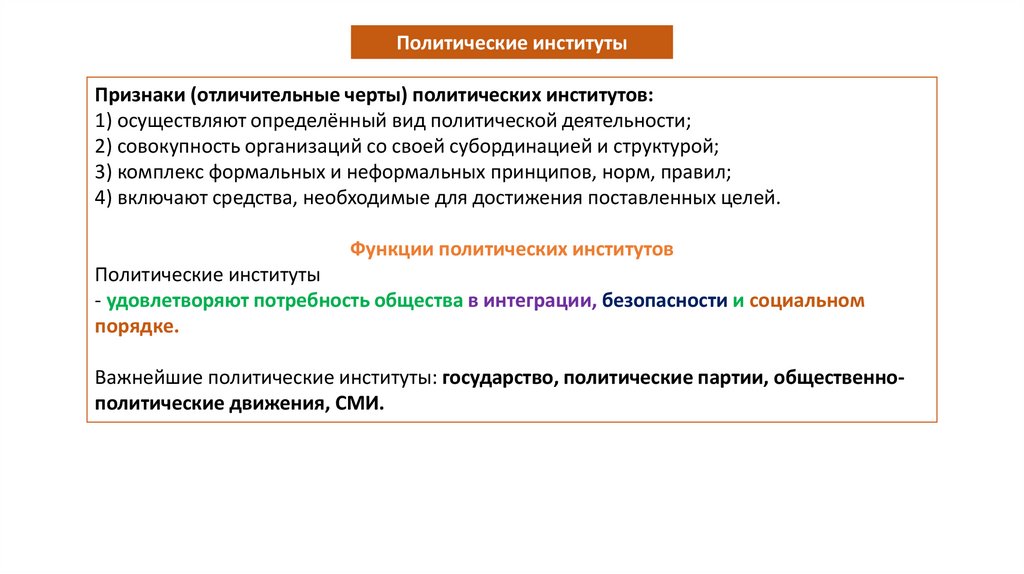 Важнейшие политические институты: государство, политические партии, общественнополитические движения, СМИ.