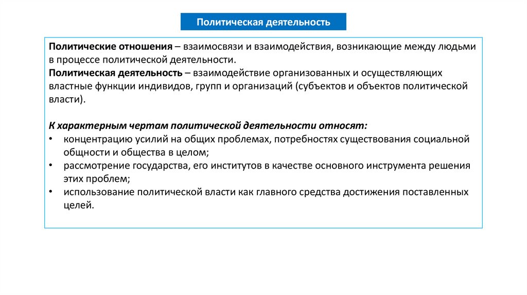 Политическая деятельностьПолитические отношения – взаимосвязи и взаимодействия, возникающие между людьми