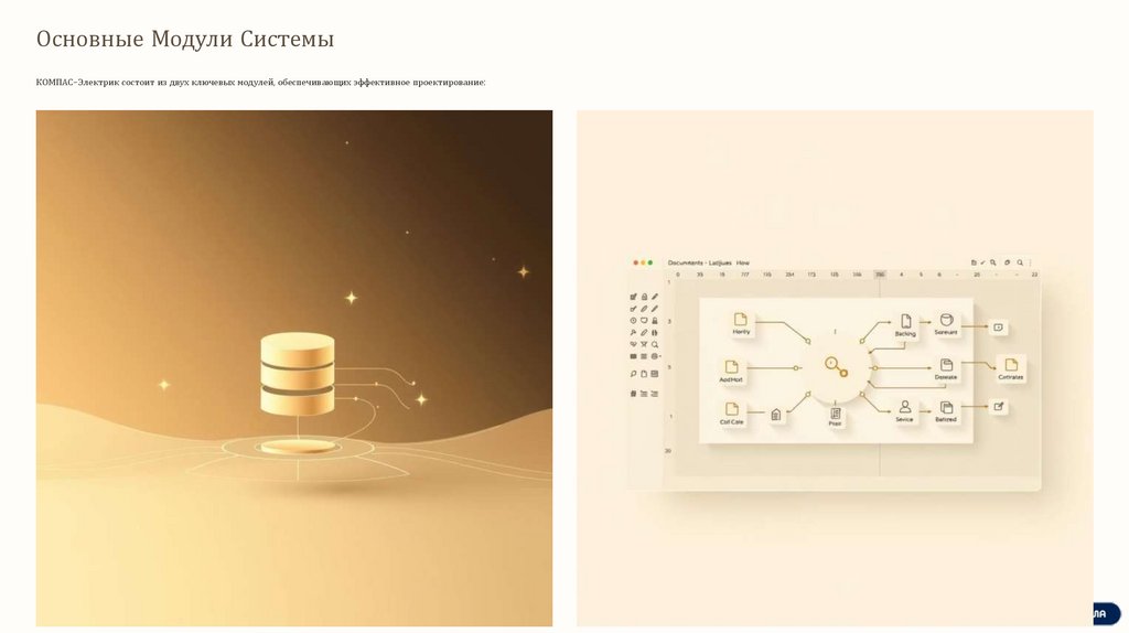 Основные Модули СистемыКОМПАС-Электрик состоит из двух ключевых модулей, обеспечивающих эффективное проектирование: