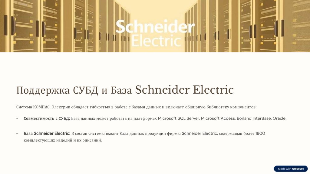 Поддержка СУБД и База Schneider ElectricСистема КОМПАС-Электрик обладает гибкостью в работе с базами данных и включает обширную библиотеку компонентов: