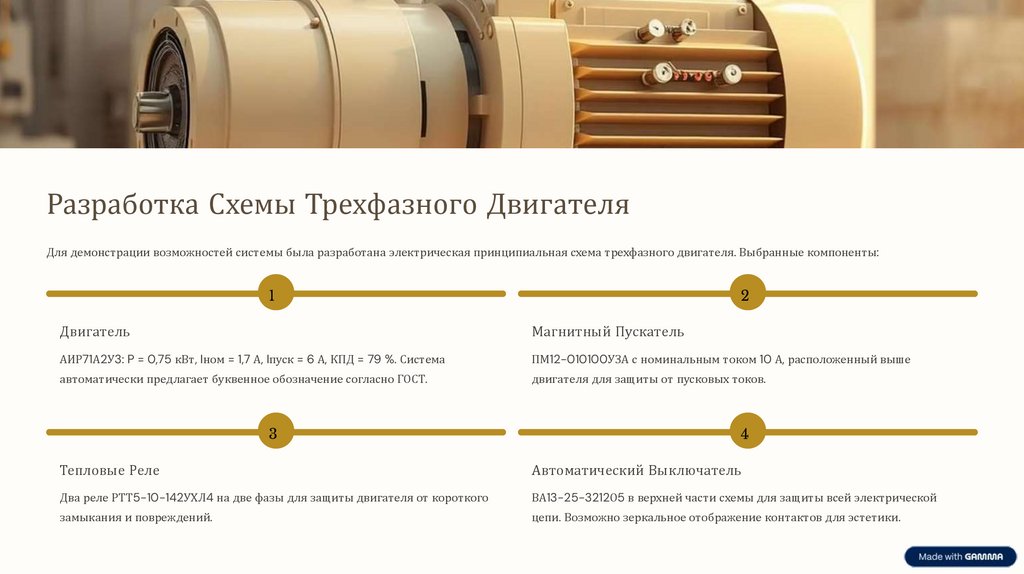 Разработка Схемы Трехфазного ДвигателяДля демонстрации возможностей системы была разработана электрическая принципиальная схема трехфазного двигателя. Выбранные компоненты: