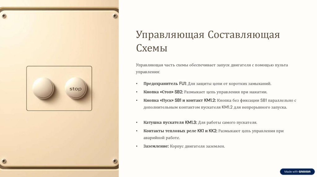 Кнопка «Стоп» SB2: Размыкает цепь управления при нажатии.