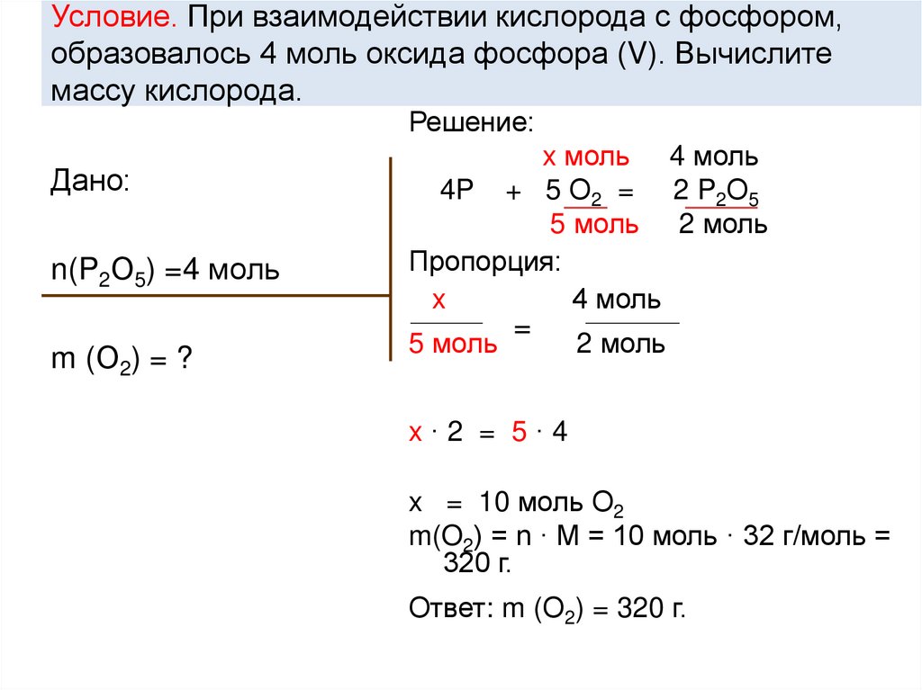 Условие. При взаимодействии кислорода с фосфором,образовалось 4 моль оксида фосфора (V). Вычислите
