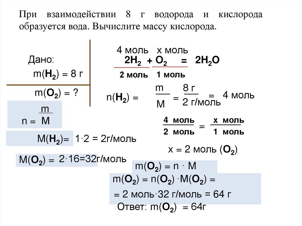 При взаимодействии 8 г водорода и кислородаобразуется вода. Вычислите массу кислорода.