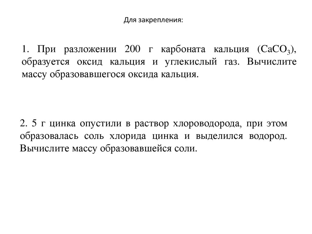 Для закрепления:1. При разложении 200 г карбоната кальция (CaCO3),