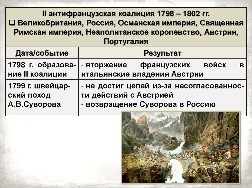 II антифранцузская коалиция 1798 – 1802 гг.Великобритания, Россия, Османская империя, Священная