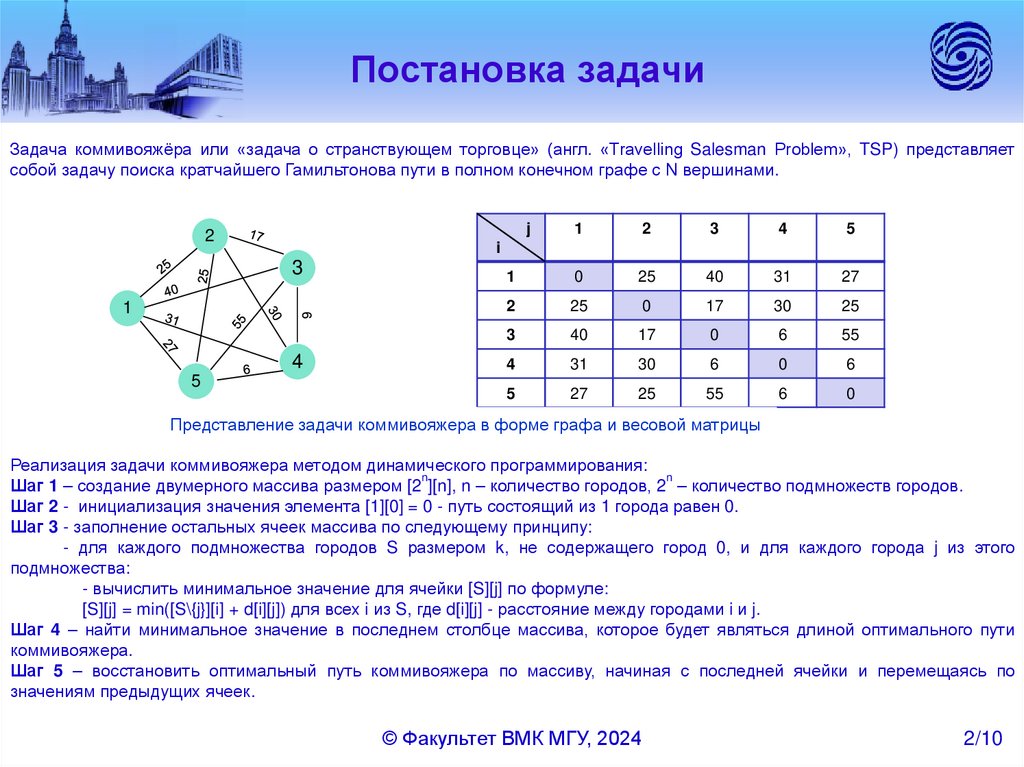 Постановка задачиЗадача коммивояжёра или «задача о странствующем торговце» (англ. «Travelling Salesman Problem», TSP) представляет