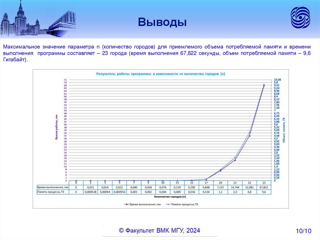 ВыводыМаксимальное значение параметра n (количество городов) для приемлемого объема потребляемой памяти и времени