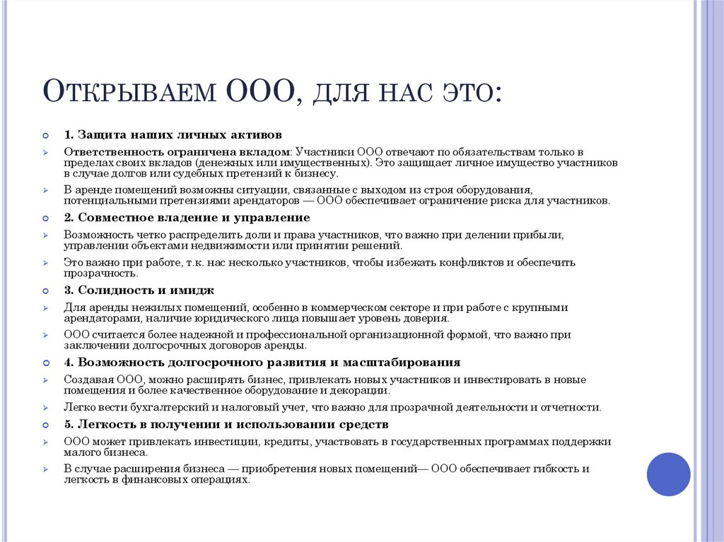 В случае расширения бизнеса — приобретения новых помещений— ООО обеспечивает гибкость и