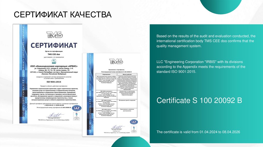 СЕРТИФИКАТ КАЧЕСТВАBased on the results of the audit and evaluation conducted, the