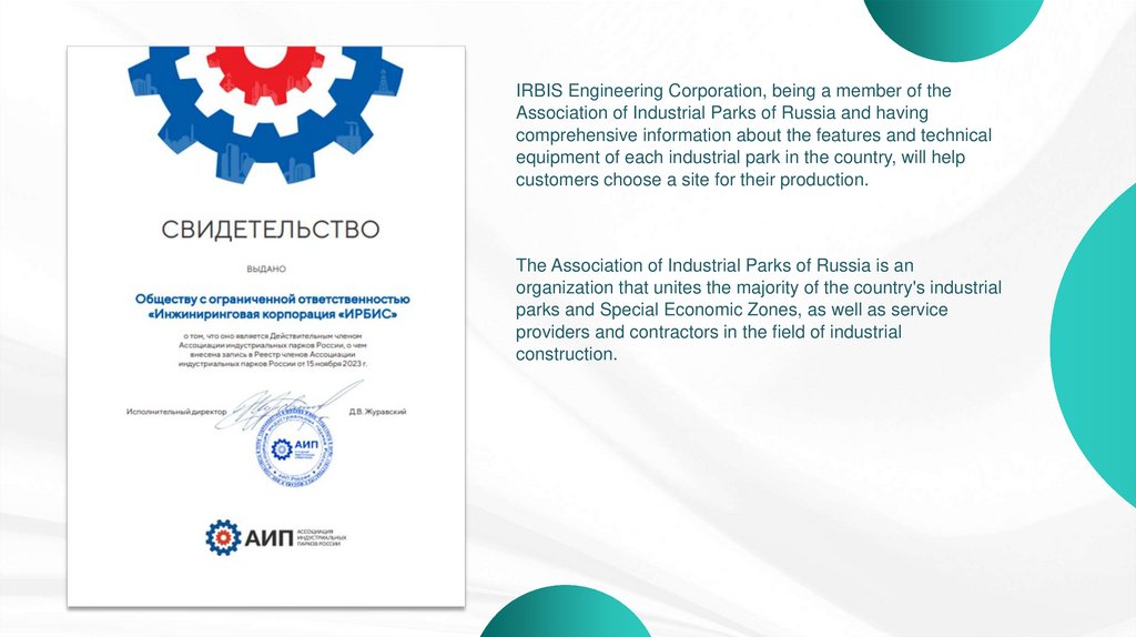 IRBIS Engineering Corporation, being a member of theAssociation of Industrial Parks of Russia and having